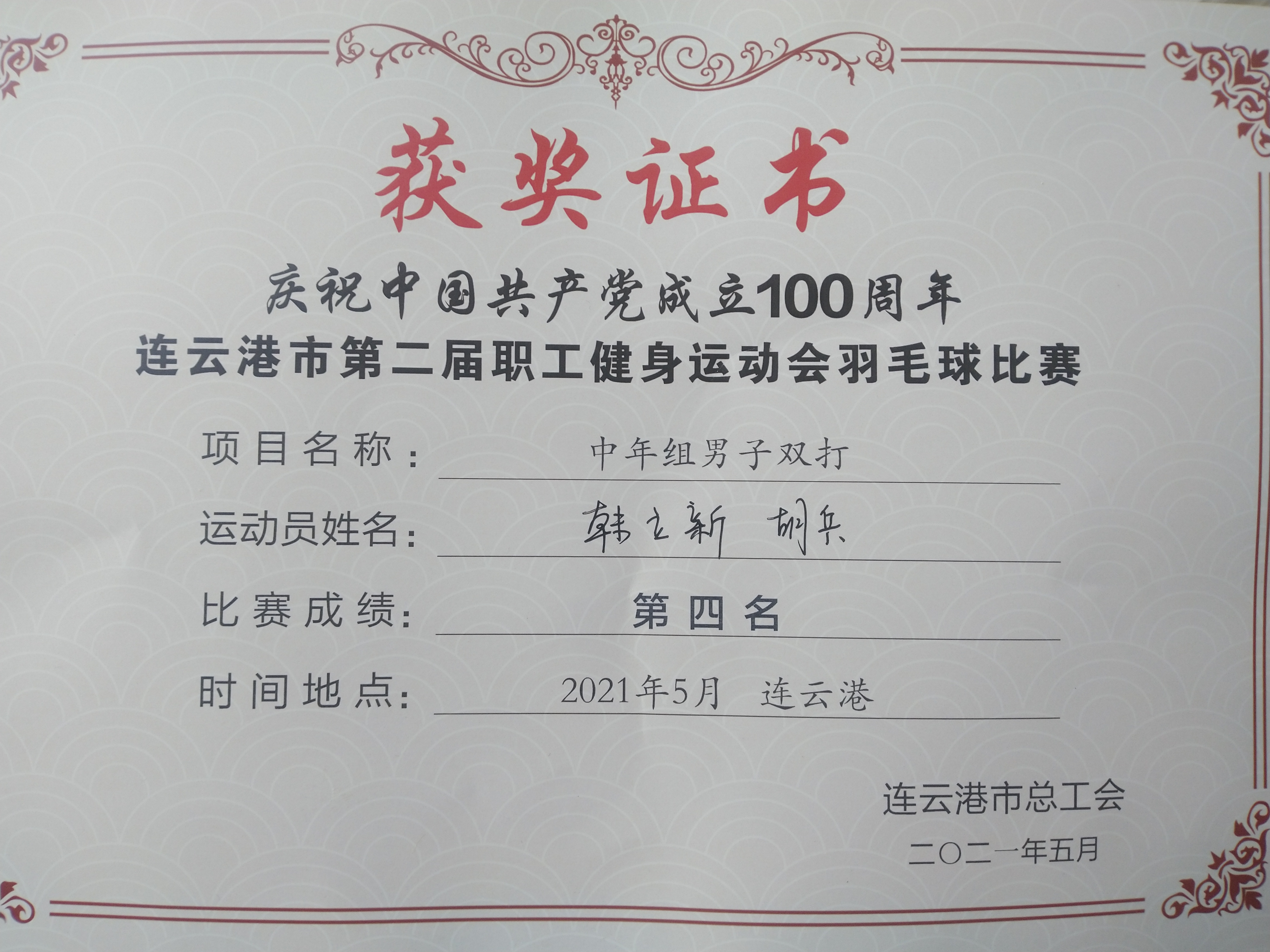 5月28-29日,市第二屆職工健身運動會羽毛球比賽在振興李寧羽毛球館舉辦,來自全市34支代表隊,293名選手參賽。經過激烈角逐,韓立新、胡兵在中年男子雙打比賽中取得了第四名的好成績。
