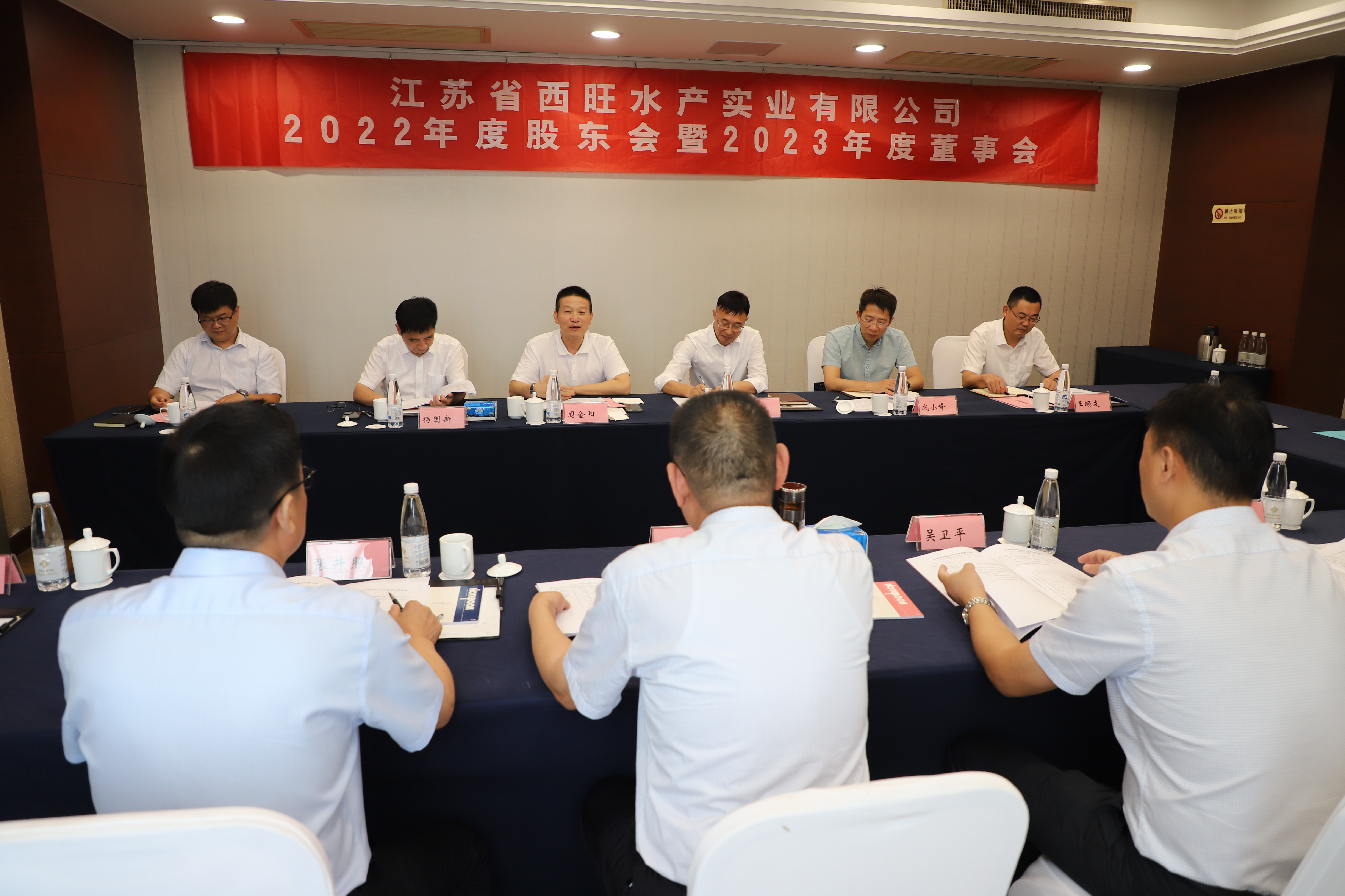 8月17日,江蘇省西旺水產實業有限公司2022年度股東會暨2023年度董事會在連云港市云臺賓館一樓會議室召開,省沿海開發集團黨委副書記、總經理周金陽,省沿海開發集團投資發展部副總經理成小峰,省沿海開發集團企業管理部副總經理陳齊,市工業投資集團黨委副書記、副董事長、總經理張六林,市工業投資集團黨委委員、常務副總經理楊國新等股東代表、董事代表出席了會議。
