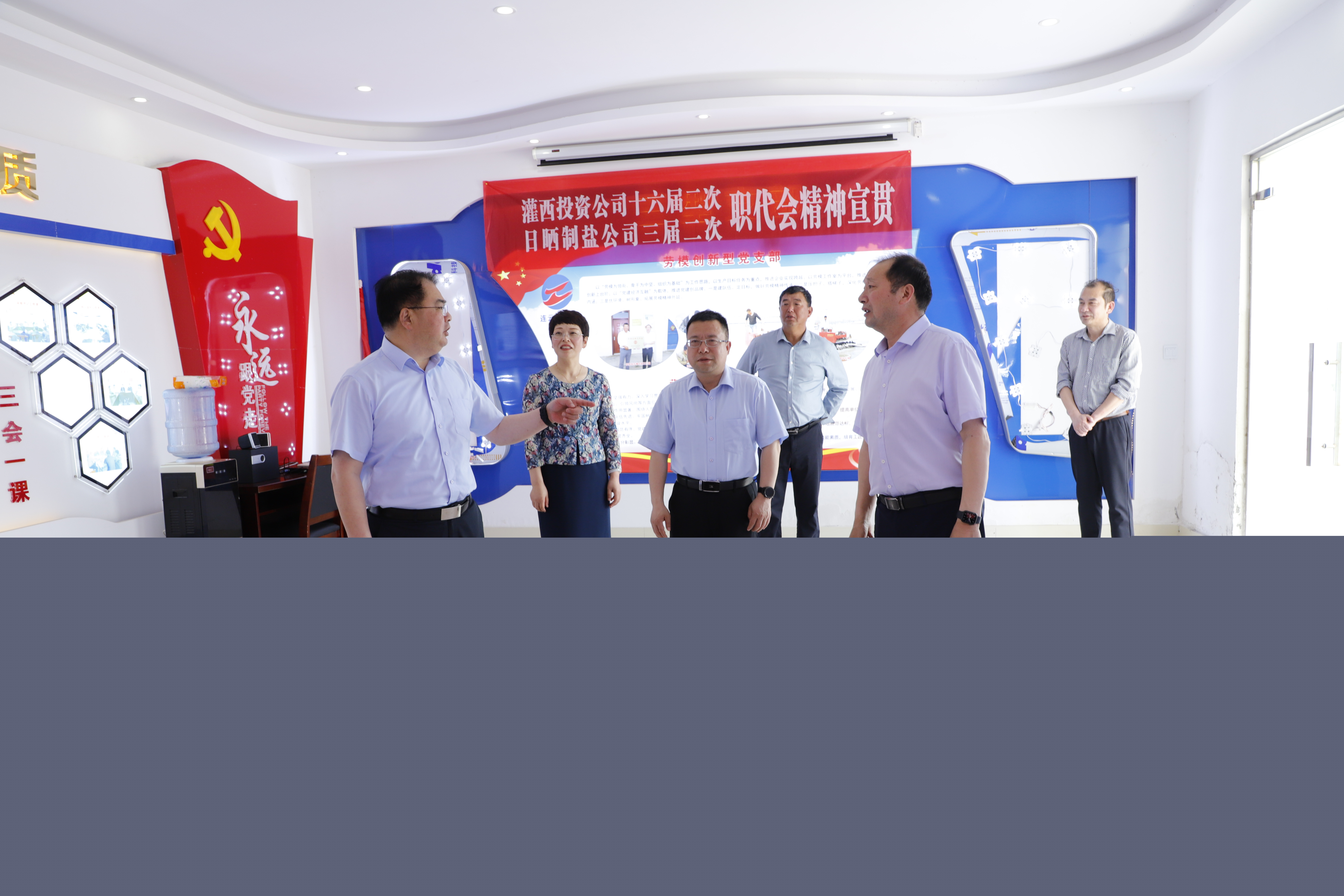 戴鴻鳴書記一行分別到日曬制鹽新河分公司八班的扒鹽現場、零班的班組活動室、新河分公司黨建活動室和安樹林勞模創新工作室實地調研,對黨建陣地建設提出指導意見,他指出,基層一線的陣地建設是企業文化建設的重要組成部分,是公司的形象窗口,陣地建設要因地制宜,打造特色,要進一步完善設計方案,盡快把活動室高標準高質量建起來。
