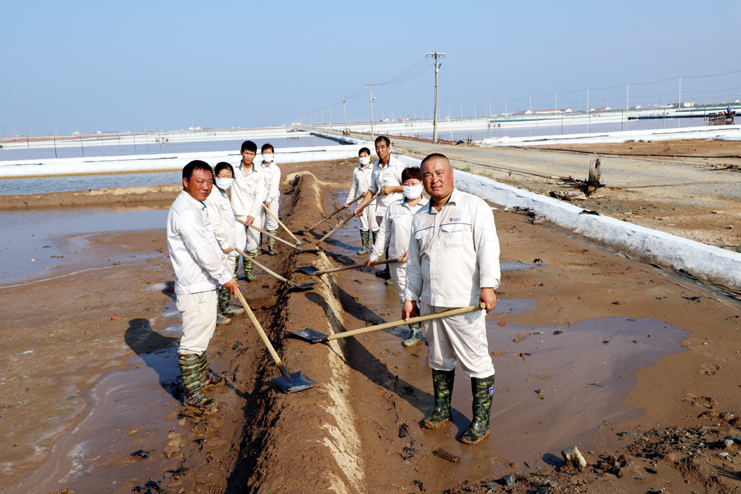 8月9日,室外溫度36攝氏度,地面溫度43攝氏度。上午6點半,筆者來到新河制鹽分公司八班,恰逢工人在修整鹽稟。筆者看到,8班班長祝星星拿起鐵鍬,帶領幾名員工在高溫下挖溝取土修稟基,沒干一會就有大滴的汗水從他的面頰掉落,盡管汗水布滿面頰,但工人們的動作幅度絲毫不減,稟基在他們的修整下整齊劃一,一幅鹽灘工人戰高溫、奪高產的美麗畫卷呈現在眼前。