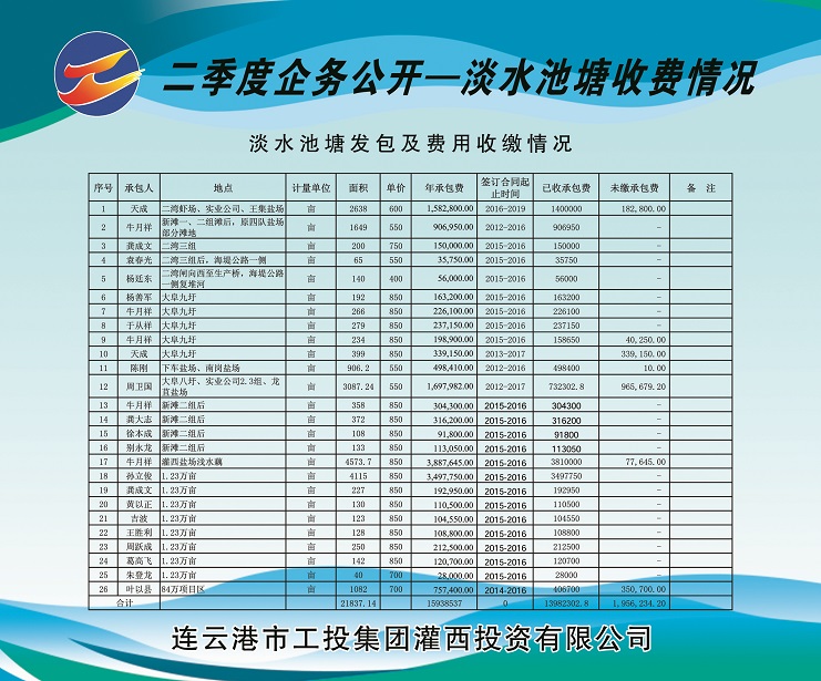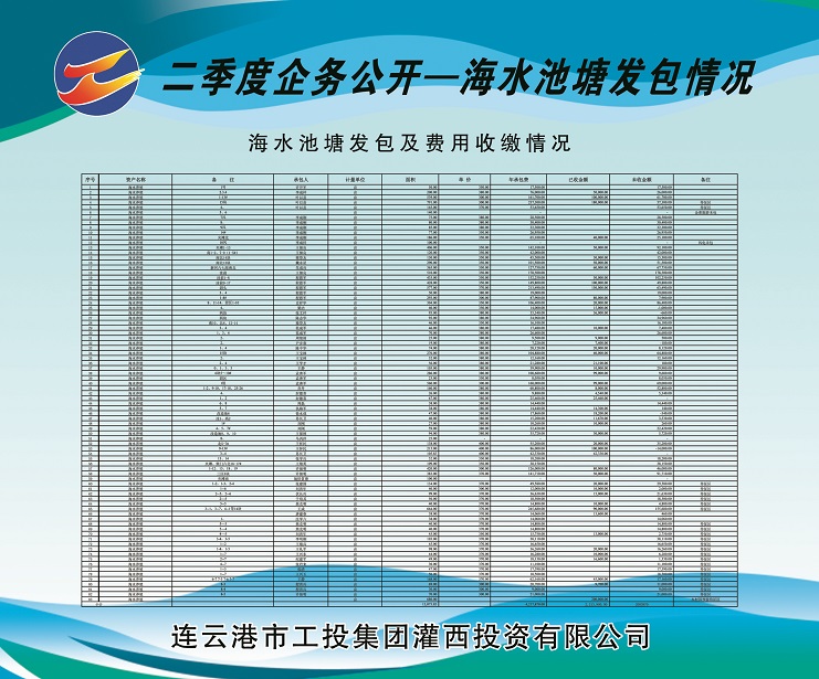 2、海水養殖池塘發包及費用收繳情況。共發包海水養殖池塘面積13073.83畝,應收租賃費421.787萬元,已收租賃費221.39萬元,欠收租賃費200.397萬元,收繳率為52%。