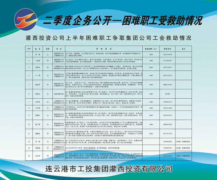 1、人員變動情況:莊忠明同志任埒南制鹽分公司黨支部副書記,免去埒南制鹽分公司副經理職務;葛高平同志任連云港宵洋物流公司黨支部書記兼工會主席;唐建軍同志任江蘇省西旺水產實業有限公司副總經理;于同剛同志任連云港市灌西實業公司制鹽分公司經理;唐廣付同志任新河制鹽分公司副經理,免去柴門制鹽分公司工會主席職務;王忠良同志任生產服務公司安全員。