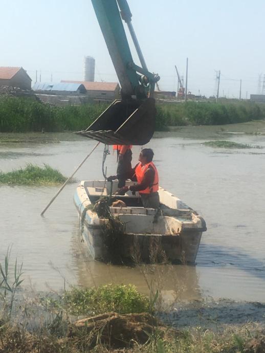 近日,機電服務公司租用長臂挖掘機清理西旺公司泵站河道的水草。又因河道中間水草面積較大,挖掘機不能完全清理,機電服務公司機電組王緒華等人,租用小船用繩子加鐵鉤等辦法,清理河道中的水草。(蘇南)