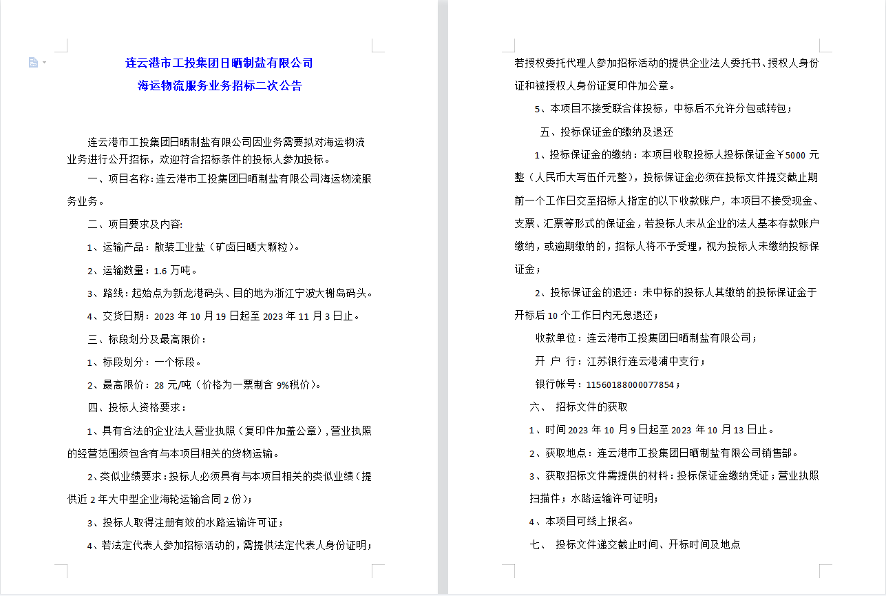 連云港市工投集團日曬制鹽有限公司 海運物流服務業務招標二次公告