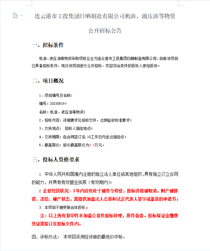 連云港市工投集團日曬制鹽有限公司機油、液壓油等物資公開招標公告
