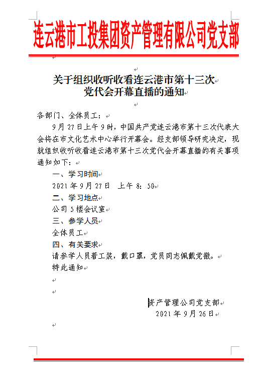 關于組織收聽收看連云港市第十三次黨代會開幕直播的通知