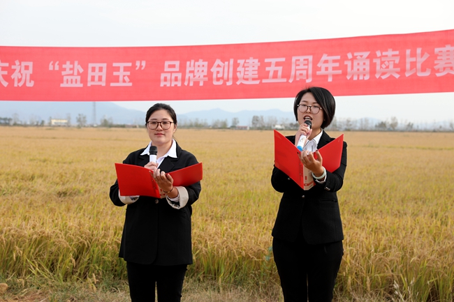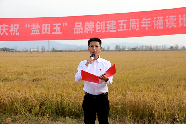 ? ?金秋十月,稻浪播香,又到一年豐收季。為慶祝“鹽田玉”品牌創建五周年,營造企業文化氛圍,展現職工群眾健康向上的精神風貌,10月25日下午,投資公司于萬畝稻田間舉行慶祝“鹽田玉”品牌創建五周年誦讀比賽。公司黨委委員、副總經理周緒祥,各單位黨政工負責人、機關全體管理人員,大新農場條田工,米業營銷中心生產銷售團隊參加活動。