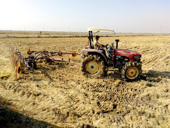 為有效防止秸稈焚燒形成的污染,保護生態環境,促進秸稈綜合利用。日前,大新農場在水稻收割的同時積極聯系秸稈回收廠家,對水稻秸稈進行回收打包。稻田里,帶有八個圓形大齒輪的水稻摟草機正在工作,機器行駛在收割完的稻田中,將聚攏后的秸稈進行打捆作業,所過之處水稻秸稈被卷起,變成從機械后面“吐”出的一個個圓形稻草捆。通過秸稈回收,將大大降低秸稈焚燒安全隱患和環境污染問題。 (大新農場