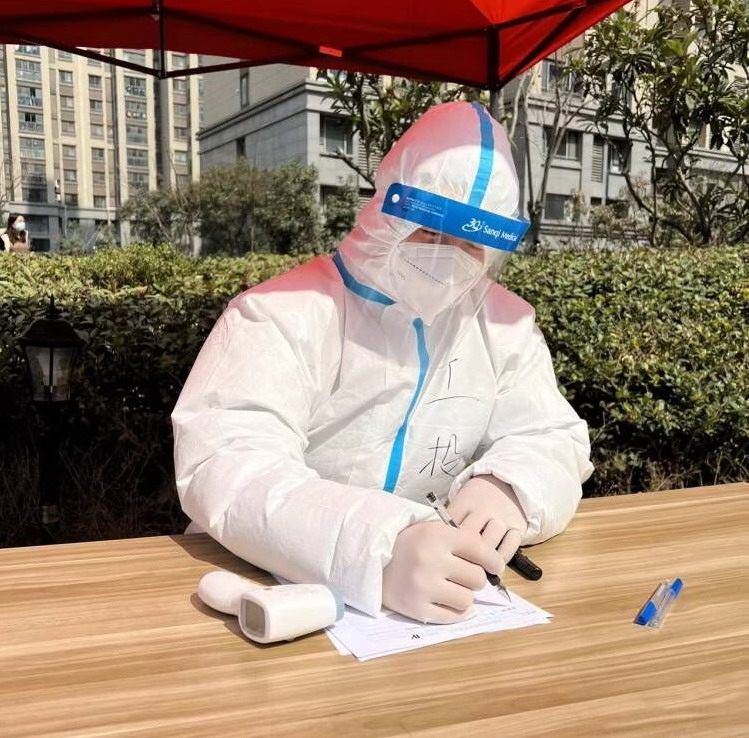 312日,社區統一安排,換了崗位,經過崗前細致培訓后,負責信息登記、測試體溫、發放檢測卡,服裝也由一次性塑料服換上了“大白服”。服裝升級了,說明防護級別也升級了,他二話沒說,服從安排,迅速到崗?!澳?,請在這邊登記信息,測量一下體溫”,這是他每天重復最多的話,他穿著密閉的防護服,連上一趟衛生間都成了一件很奢侈的事情,為了節約醫療物資,早晨不敢多喝水,工作期間不喝水,直到檢測結束才和其他工作人員一起吃飯。有人問:“這項工作有風險,怕不怕?”他說:“怕,當然怕,但和身邊的醫護人員比起來,我這點真不算什么,向他們致敬!”目前,他所在小區已經進行了13次全員核酸檢測,他每次早上7點到崗,下午2點左右結束,脫下防護服后背都是濕漉漉的。