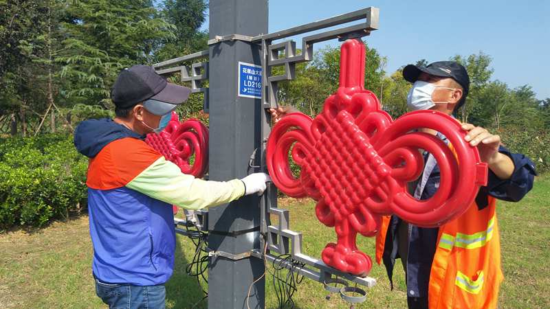 和往年一樣,今年“中秋”“國慶”兩節前夕,資源管理分公司組織公司精兵強將加入到翔立分公司兩節前道路亮化景觀突擊行動中,該公司這些志愿者隊員有的維修破損的中國結紅燈籠等亮化燈,有些負責安裝、運輸,為在節前加快完成安裝任務貢獻了自己的力量。圖為該公司志愿者在安裝自貿區主干道上的“中國結”亮化路燈。